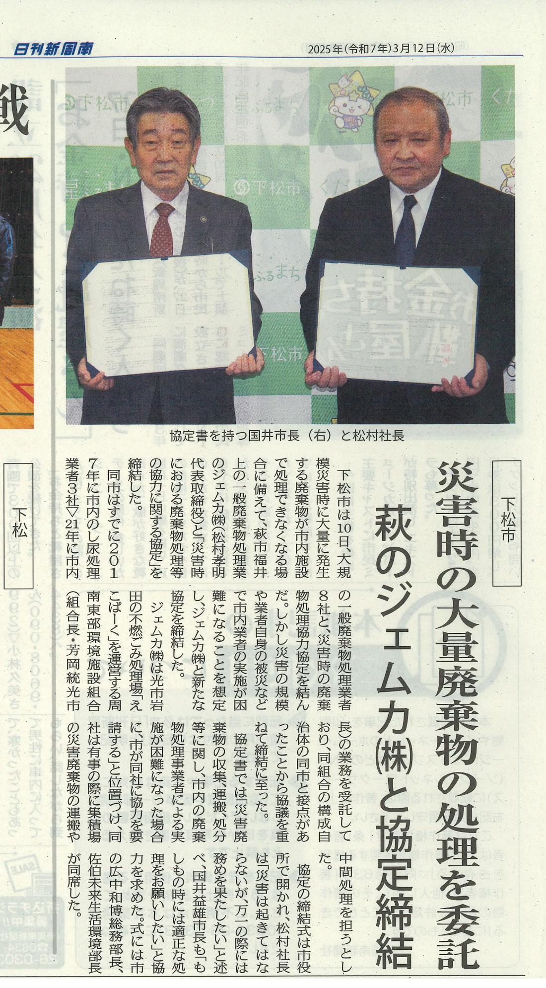 2025年3月10日に下松市と「災害時における廃棄物処理等の協力に関する協定」を締結しました。